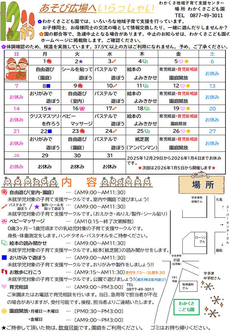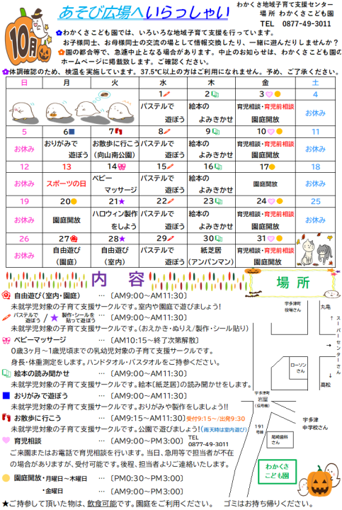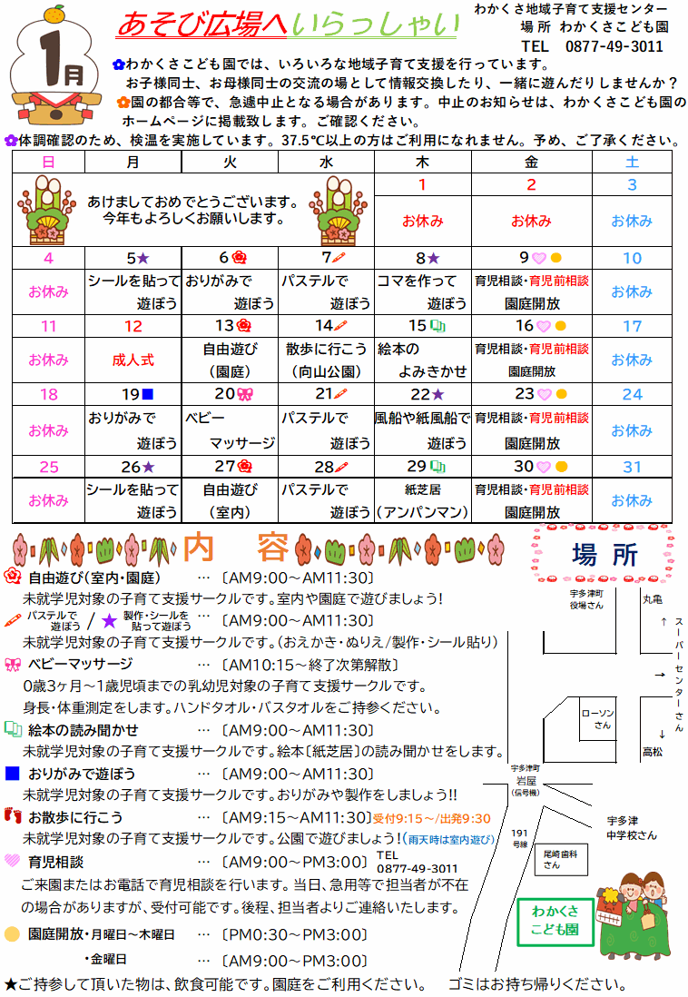 当支援センターご利用の際、及びわかくさこども園内では、お子様から目を離さないようお願い申し上げます。当支援センターは、場所・遊びの提供をいたします。担当者による保育の現場ではありません。当支援センターご利用の際は、保護者の皆様は、各自で充分にご注意・ご配慮頂きますようお願い申し上げます。