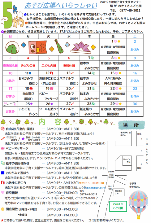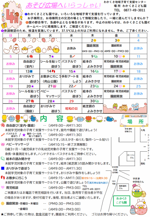 わかくさこども園では、平成5年より、在宅児童を対象にした育児支援を実施しております。
